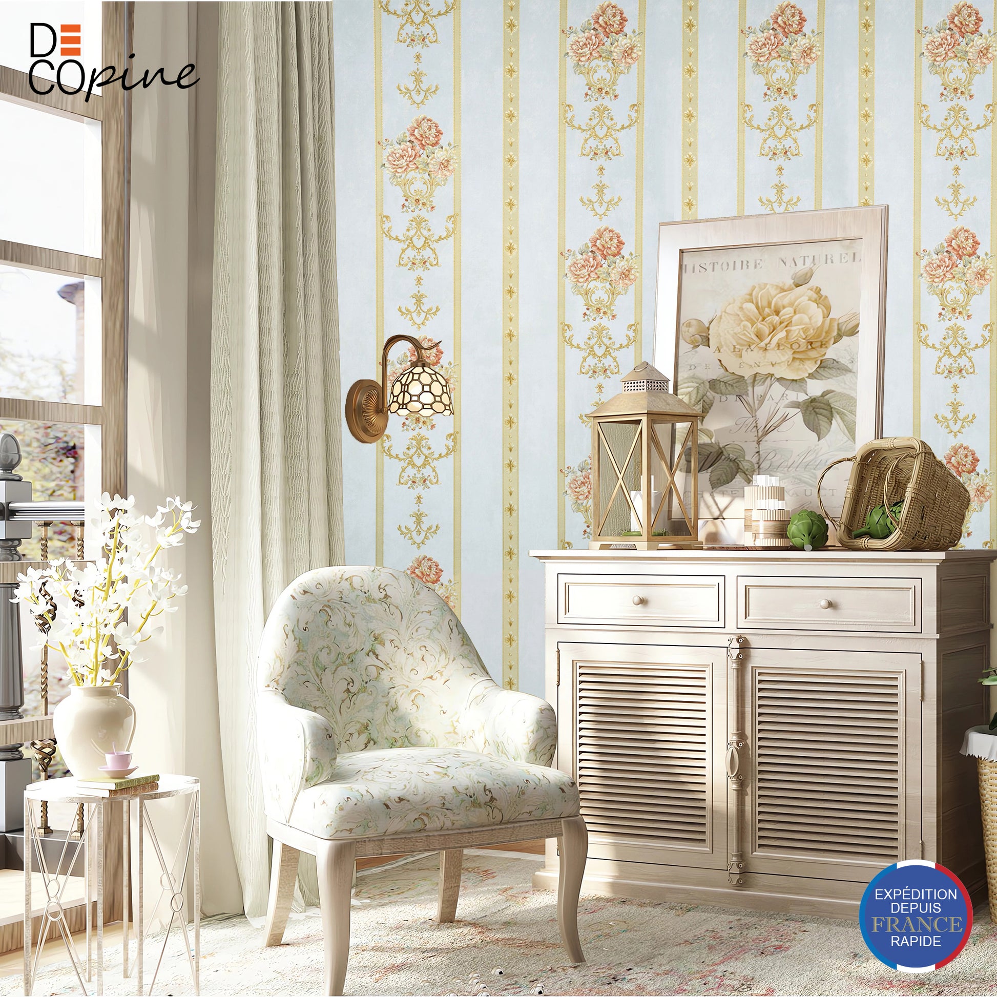 Ce papier peint intissé de la collection Ruban Royal allie un fond bleu pâle lumineux à des rayures verticales dorées et des bouquets floraux d’inspiration baroque. Il évoque la grâce des intérieurs princiers tout en apportant une touche de légèreté moderne.